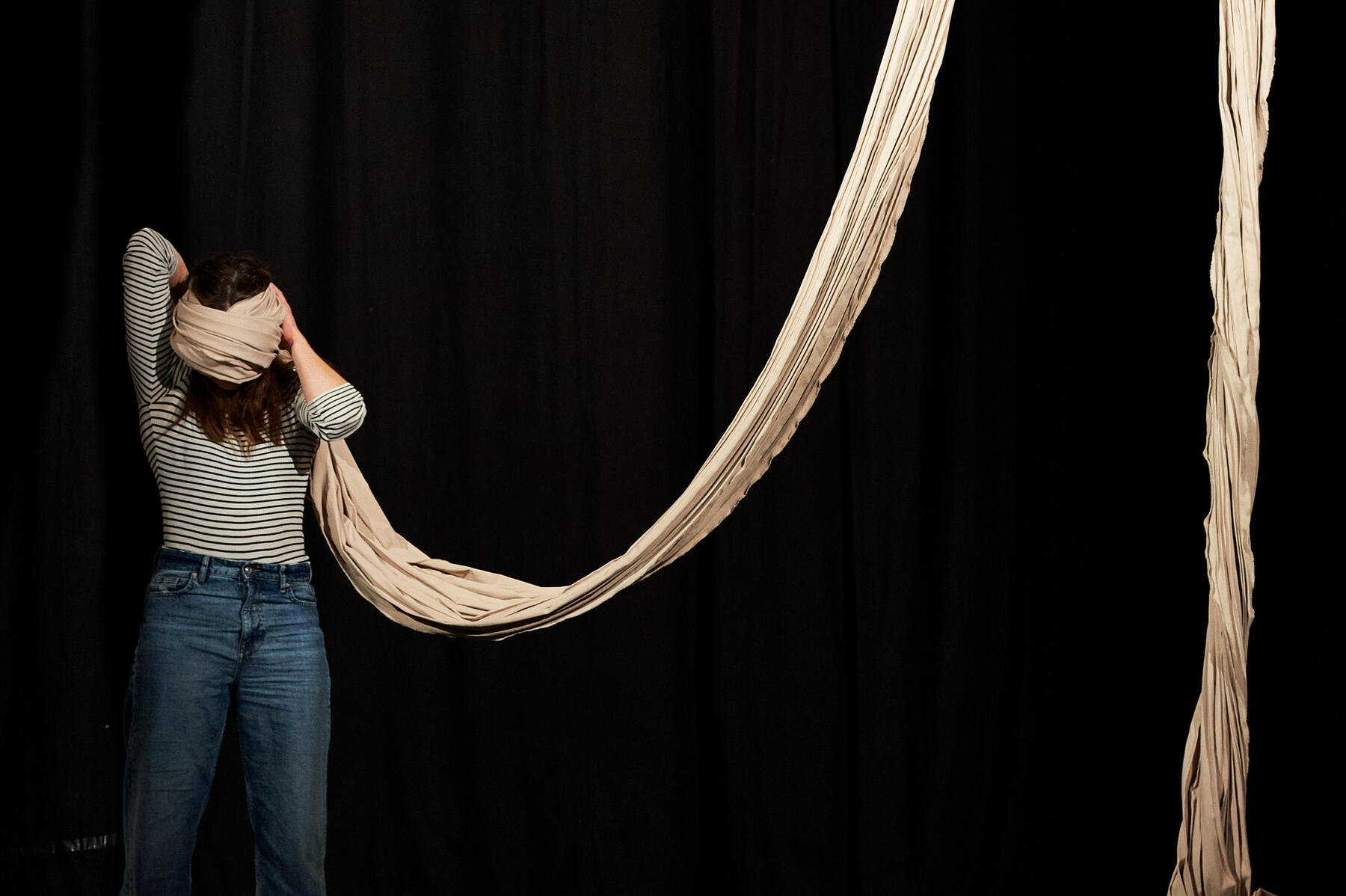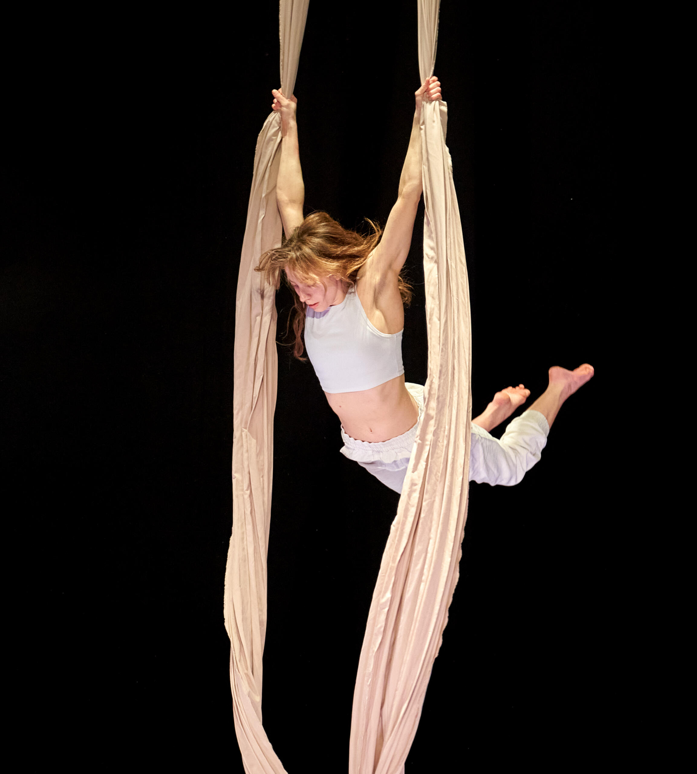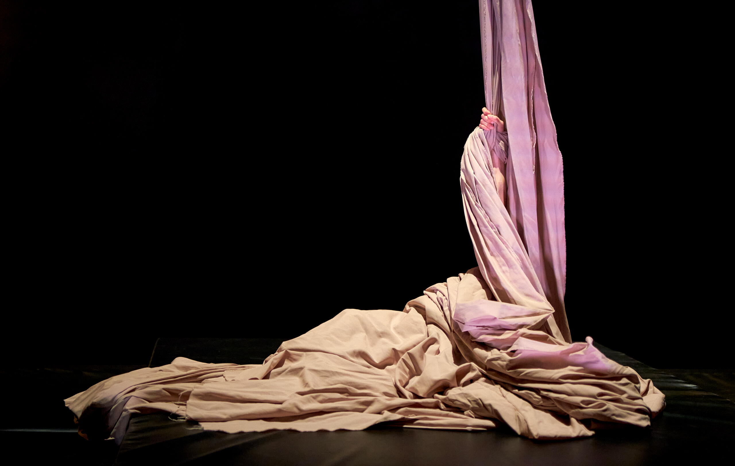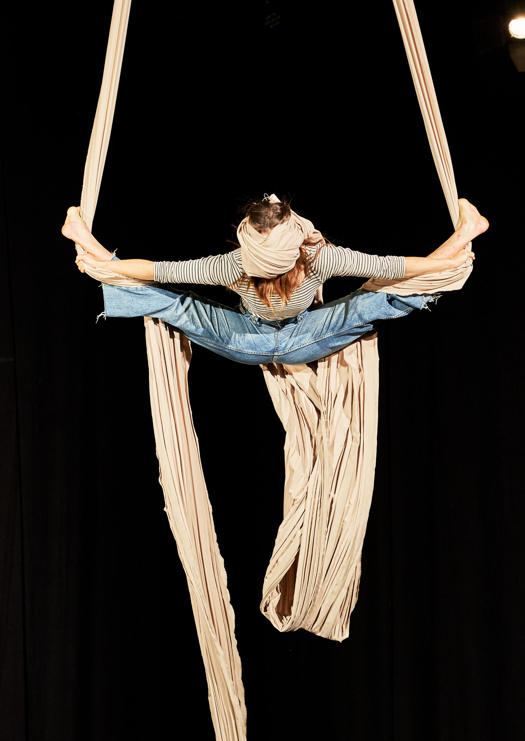 Playing with restrictions, loss of senses, and defiance of our limitations. Performed while blindfolded by the silks, this act explores what happens when the performer has to take special care of the movements of their body.